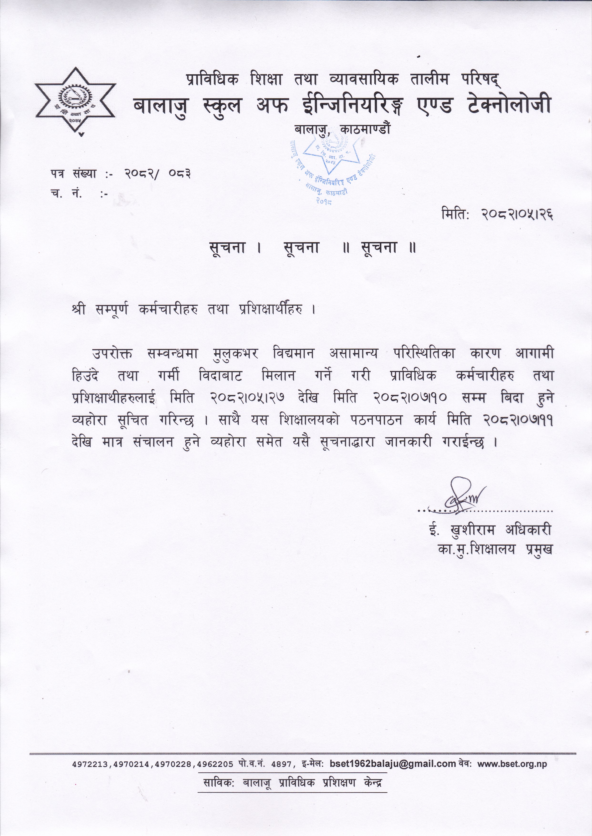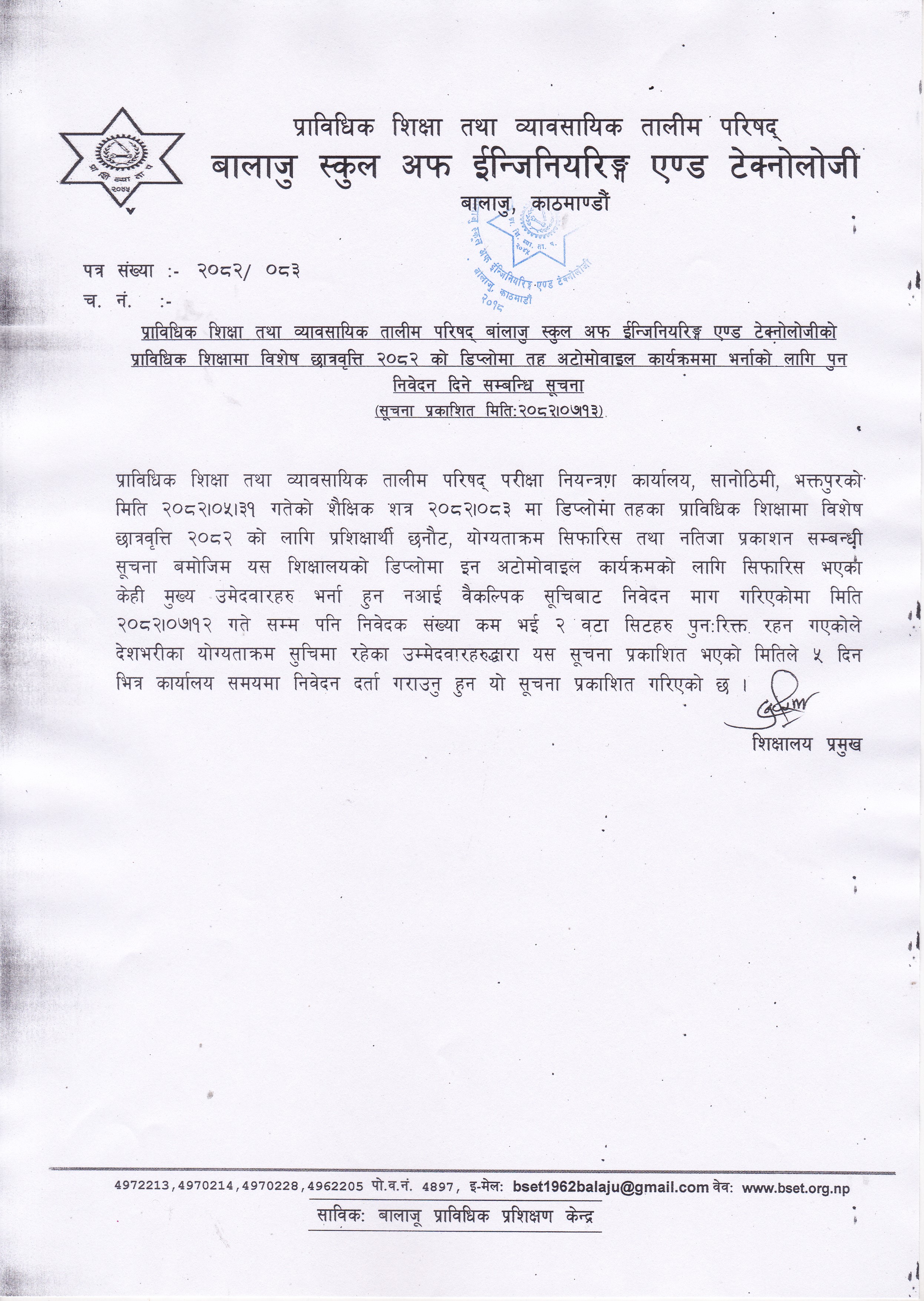 प्राविधिक शिक्षा तथा व्यावसायिक तालीम परिषद् बालाजु स्कूल अफ इन्जिनियरिङ्ग एण्ड टेक्नोलोजीको प्राविधिक शिक्षामा विशेष छात्रवृत्ति २०८२ को डिप्लोमा तह अटोमोवाइल कार्यक्रममा भर्नाको पुन: निवेदन दिने सम्बन्धी सूचना । 2025-10-30