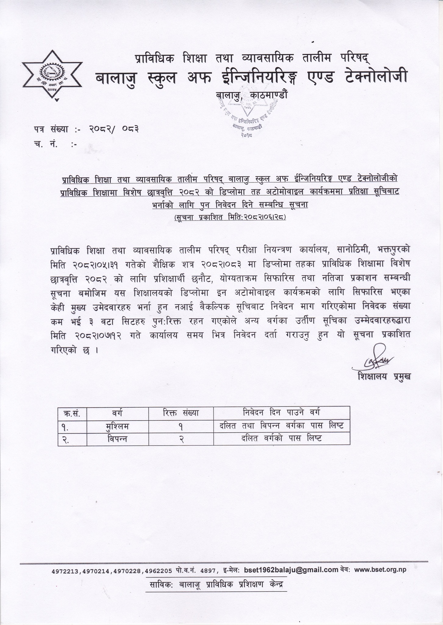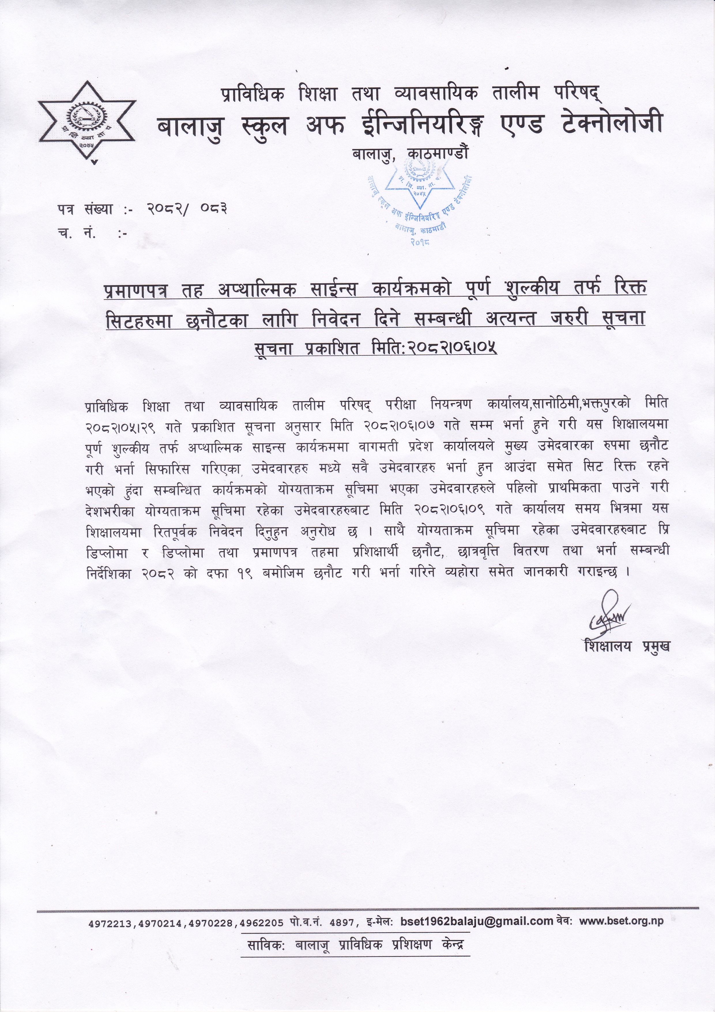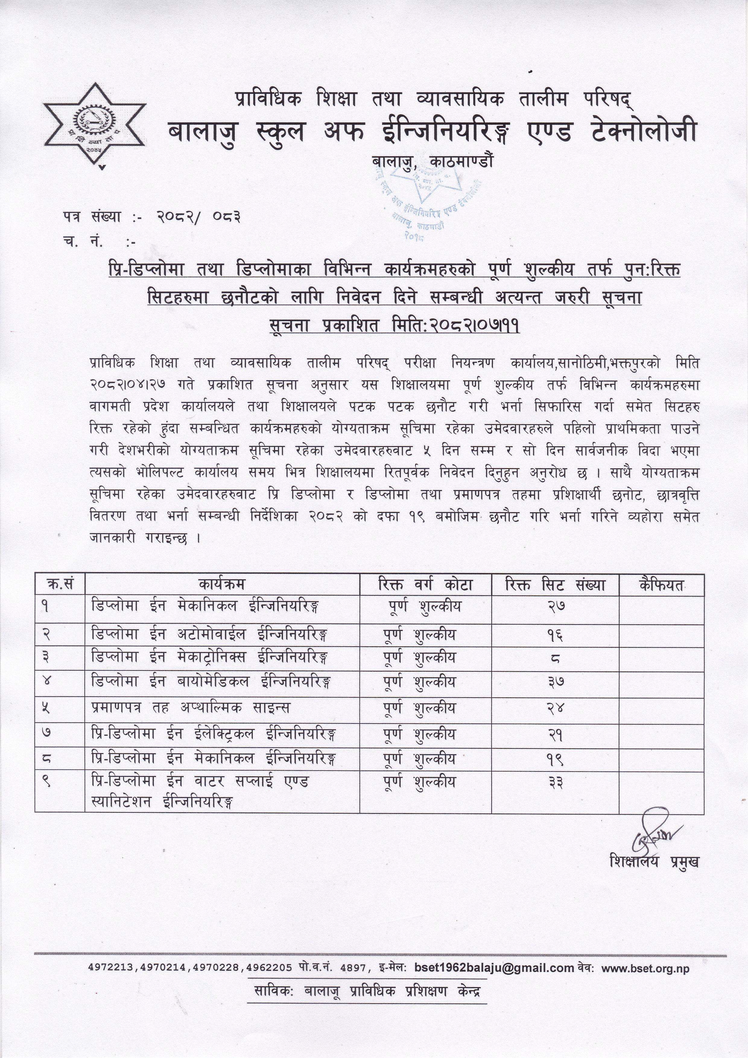 प्राविधिक शिक्षा तथा व्यावसायिक तालीम परिषद्को बालाजु स्कूल अफ इन्जिनियरिङ्ग एण्ड टेक्नोलोजीको प्राविधिक शिक्षामा विशेष छात्रवृत्ति २०८२ को डिप्लोमा तह अटोमोवाइल कार्यक्रममा प्रतिक्षा सूचिबाट भर्नाको पुन: निवेदन दिने सम्बन्धी सूचना । 2025-10-16