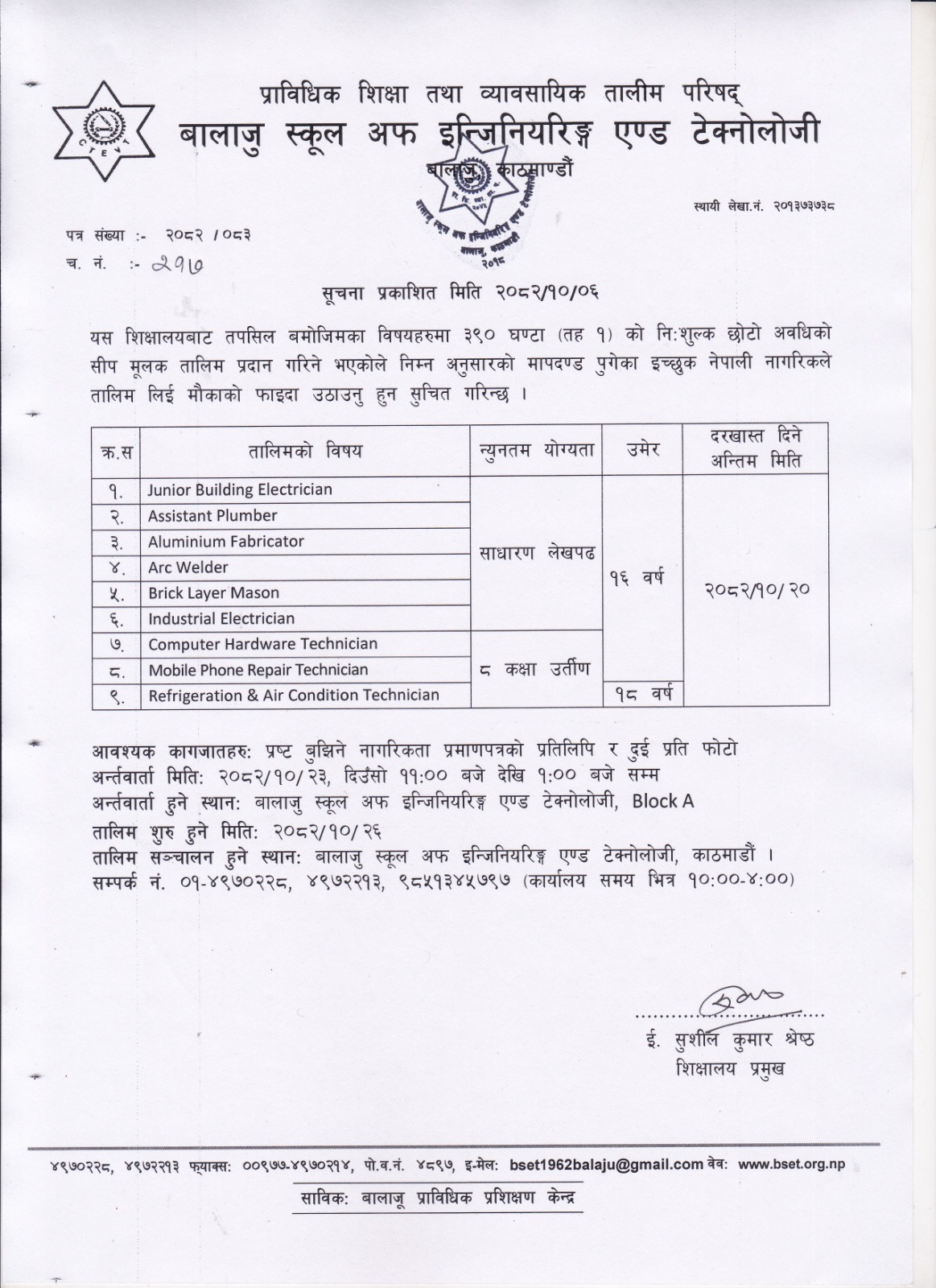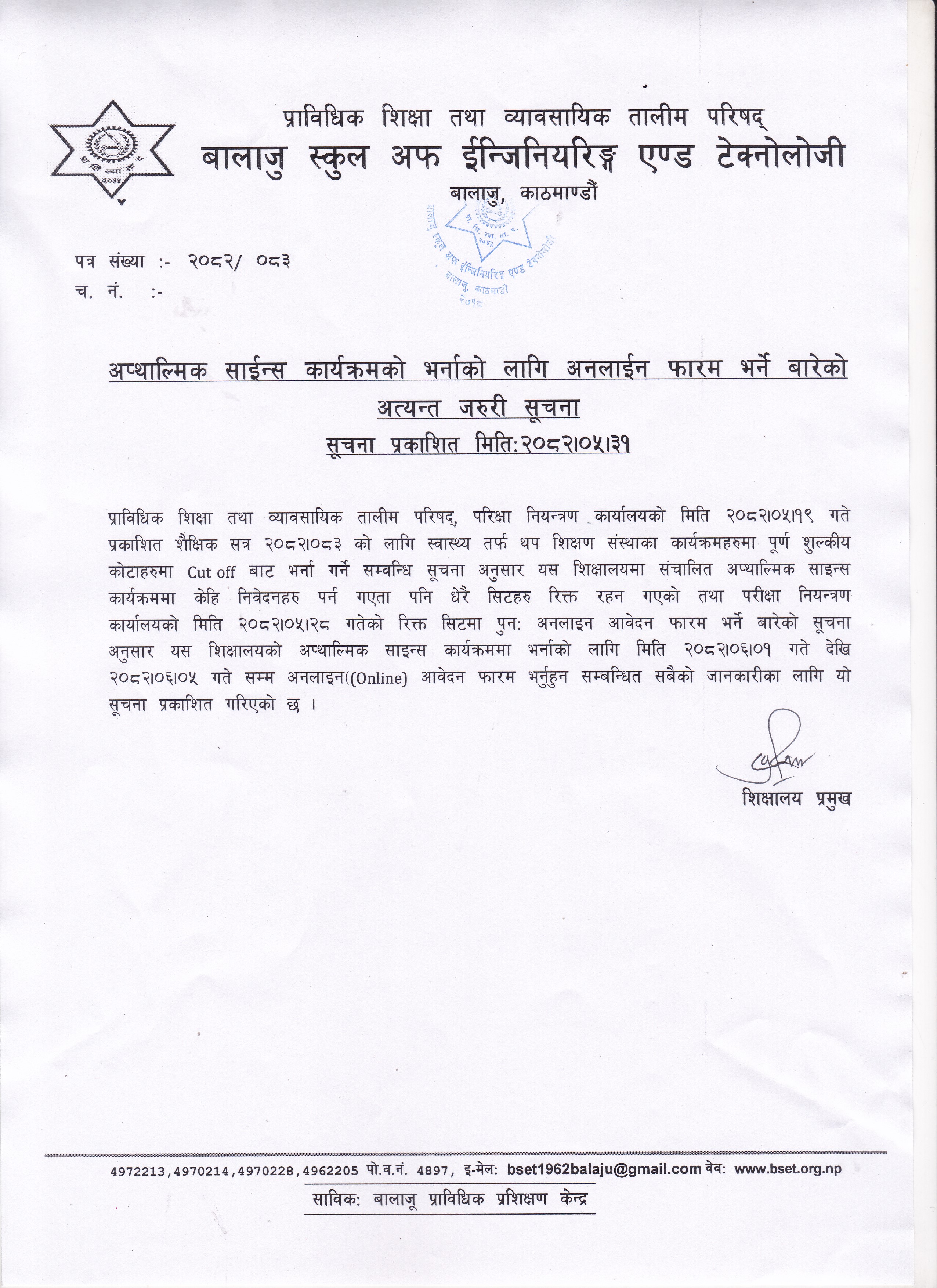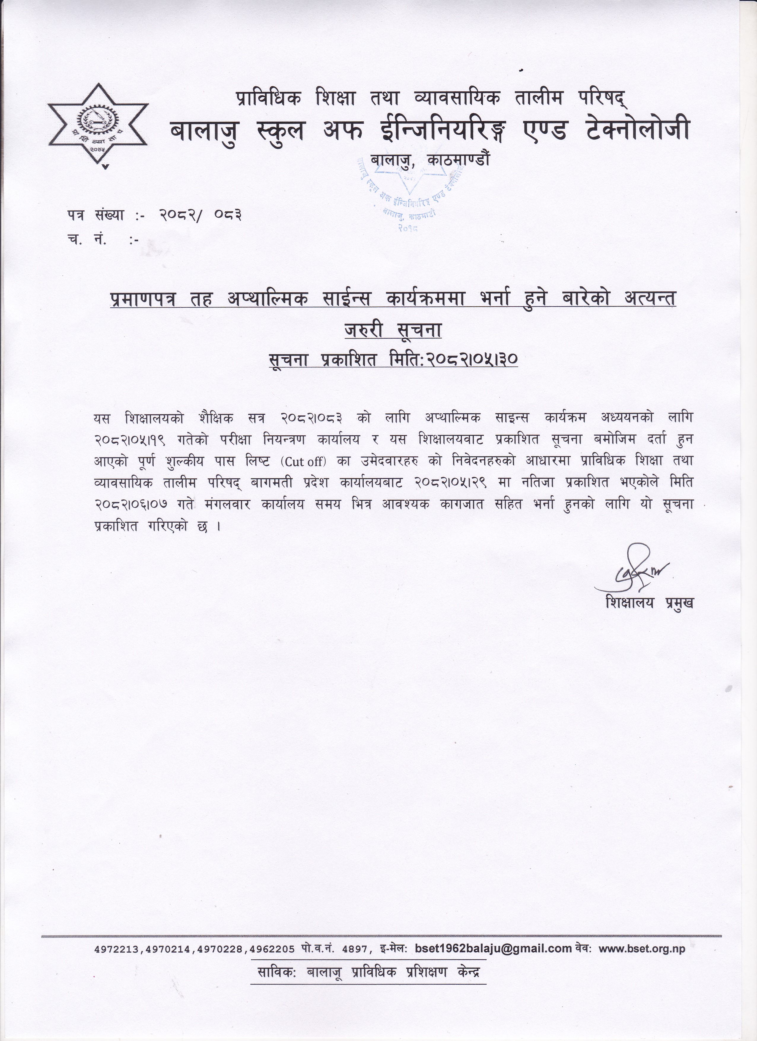 प्राविधिक शिक्षा तथा व्यावसायिक तालीम परिषद्को बालाजु स्कूल अफ इन्जिनियरिङ्ग एण्ड टेक्नोलोजीको प्राविधिक शिक्षामा विशेष छात्रवृत्ति २०८२ को डिप्लोमा तह अटोमोवाइल कार्यक्रममा प्रतिक्षा सूचिबाट भर्नाको पुन: निवेदन दिने सम्बन्धी सूचना । 2025-10-16