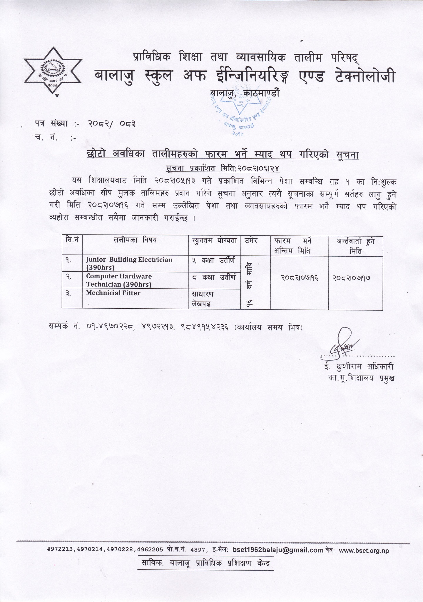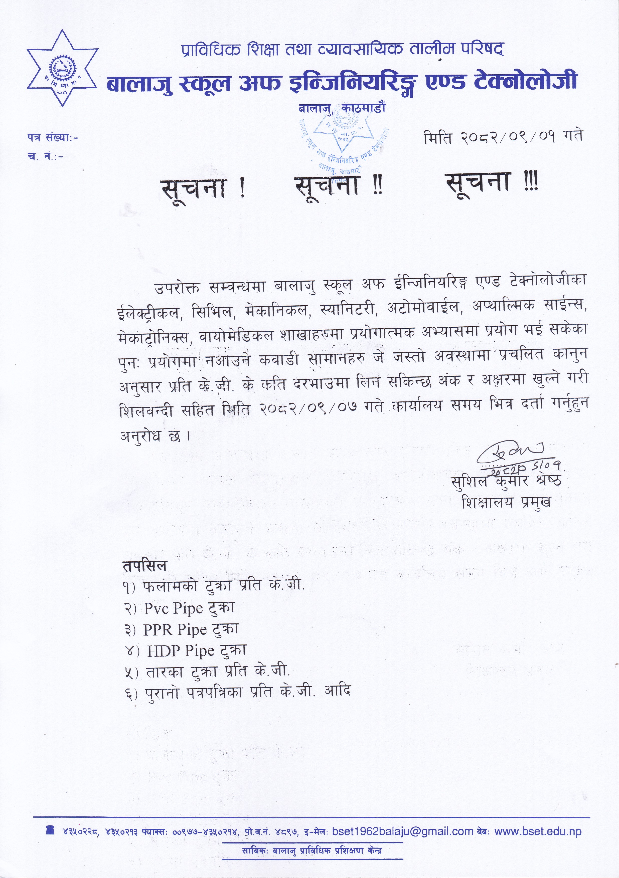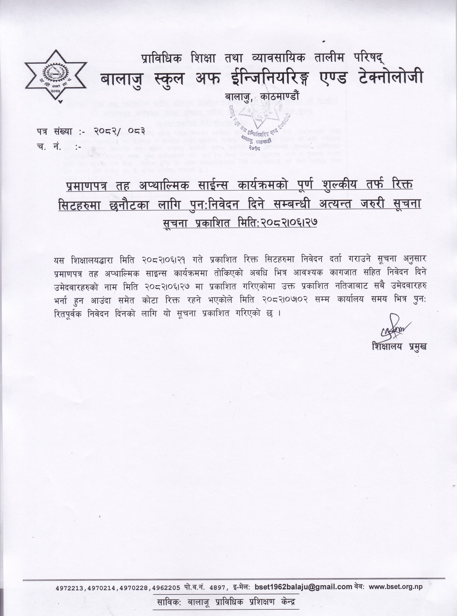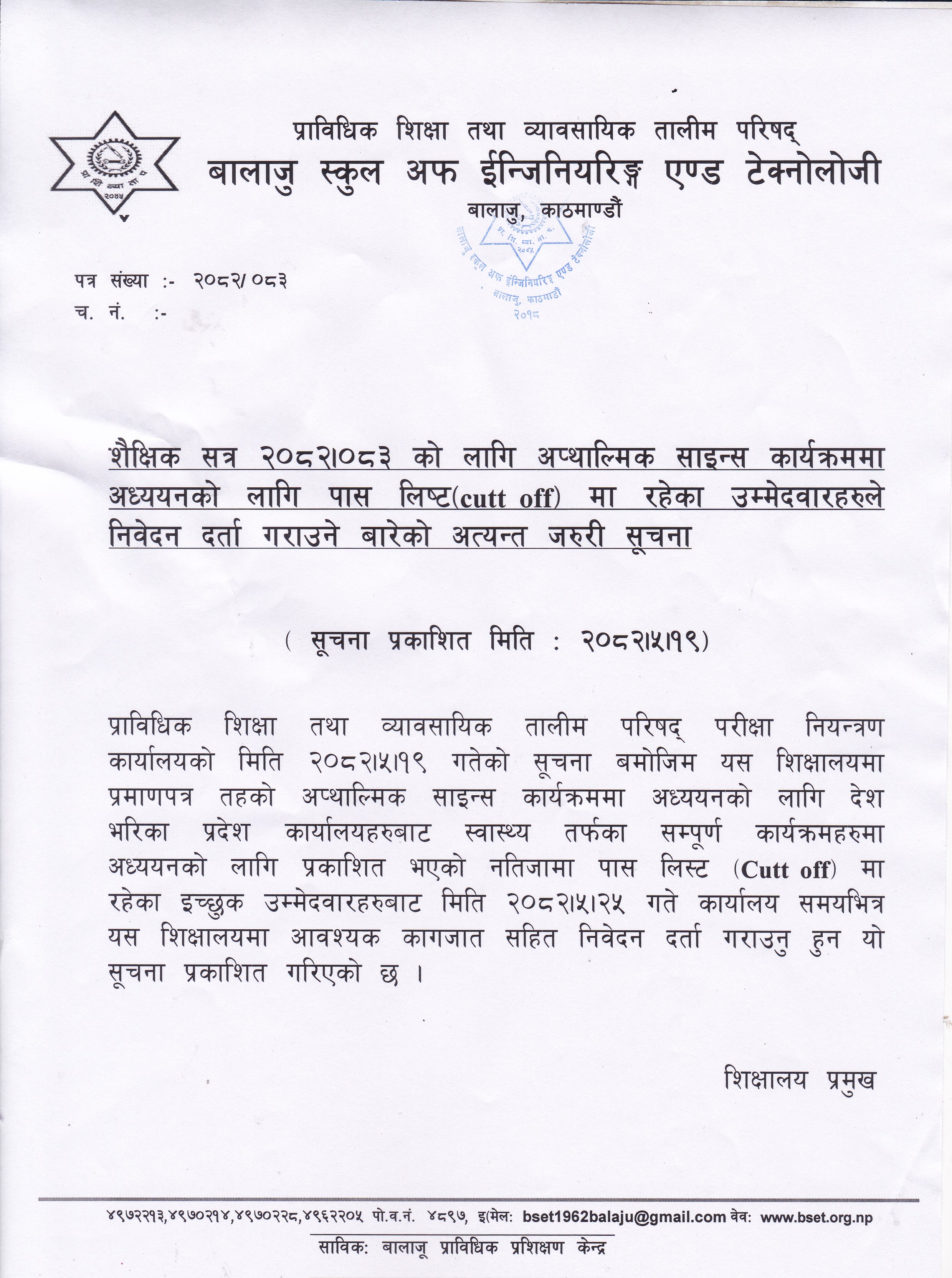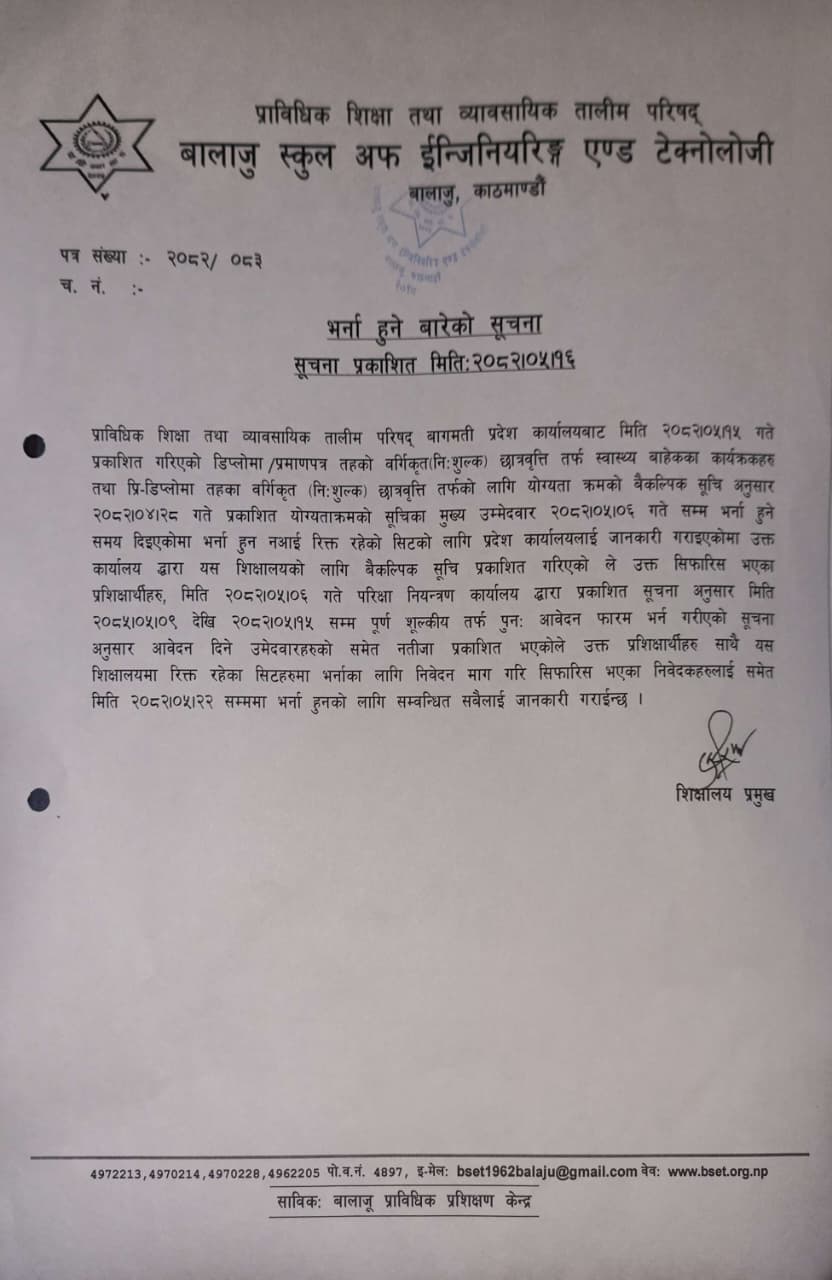 प्राविधिक शिक्षा तथा व्यावसायिक तालीम परिषद्को बालाजु स्कूल अफ इन्जिनियरिङ्ग एण्ड टेक्नोलोजीको प्राविधिक शिक्षामा विशेष छात्रवृत्ति २०८२ को डिप्लोमा तह अटोमोवाइल कार्यक्रममा प्रतिक्षा सूचिबाट भर्नाको पुन: निवेदन दिने सम्बन्धी सूचना । 2025-10-16