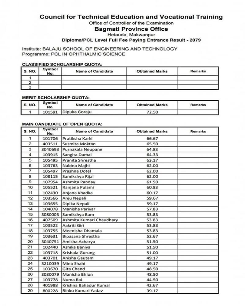PCL In Ophthalmic Science Entrance Result - 2081